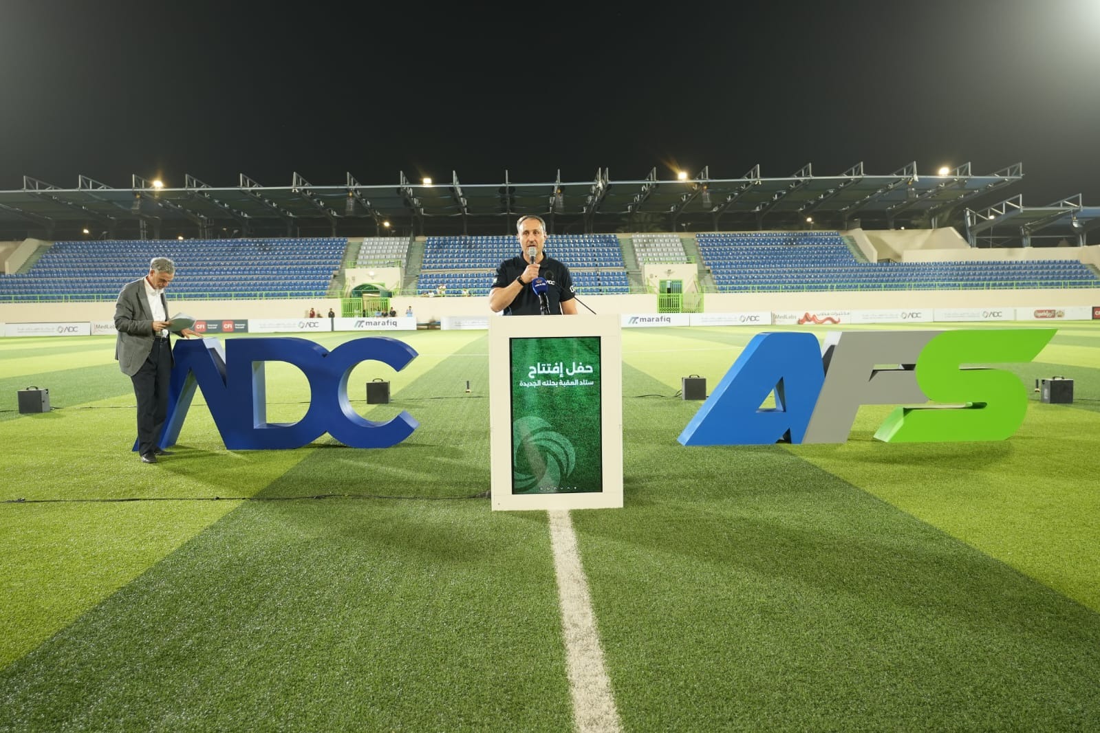 وأشار إلى أن مشروع التطوير شمل تنفيذ منظومة متكاملة من التحديثات الفنية والإنشائية وفق أحدث المواصفات الدولية، حيث تم تركيب شاشة عرض عملاقة حديثة تسهم في تعزيز التجربة البصرية للجمهور، إضافة إلى استبدال أرضية الملعب بعشب صناعي من الجيل الحديث المعتمد دوليا، بما يضمن أعلى معايير السلامة ويوفر بيئة مثالية لإقامة المباريات والبطولات.