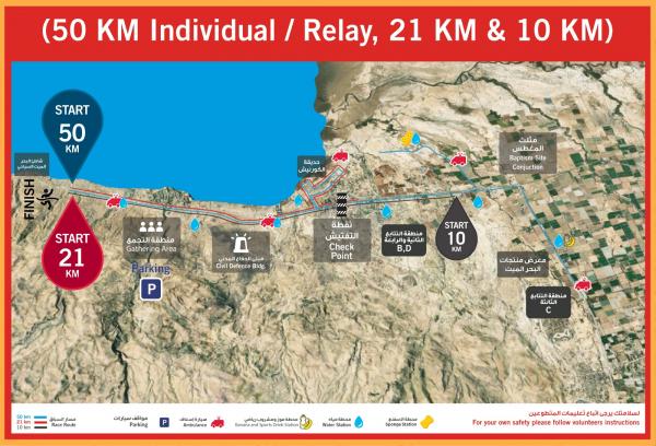ويتضمن الحدث ثلاث سباقات رئيسية، حيث ينطلق سباقا 50 كم ألترا ماراثون (فردي/تتابع) و21 كم نصف ماراثون عند الساعة 6:00 صباحاً من مقابل شاطئ عمّان السياحي، فيما ينطلق سباق 21 كم لذوي الإعاقة عند الساعة 6:10 صباحاً من نفس الموقع، بينما ينطلق سباق 10 كم عند الساعة 9:00 صباحاً من بعد 2 كم من مثلث المغطس.