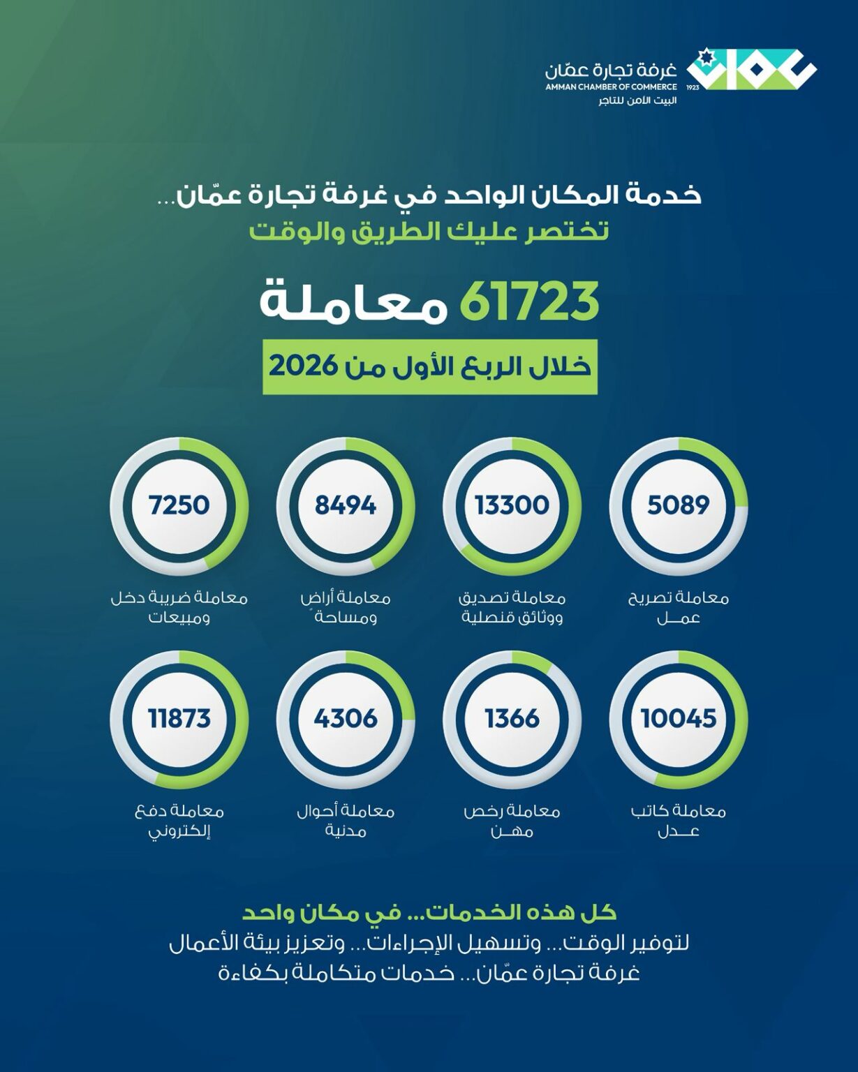أردني – أنجز مقر خدمة المكان الواحد في غرفة تجارة عمان الذي يضم العديد من الوزارات والمؤسسات الرسمية 61723 معاملة لمراجعيه خلال الربع الأول من العام الحالي.