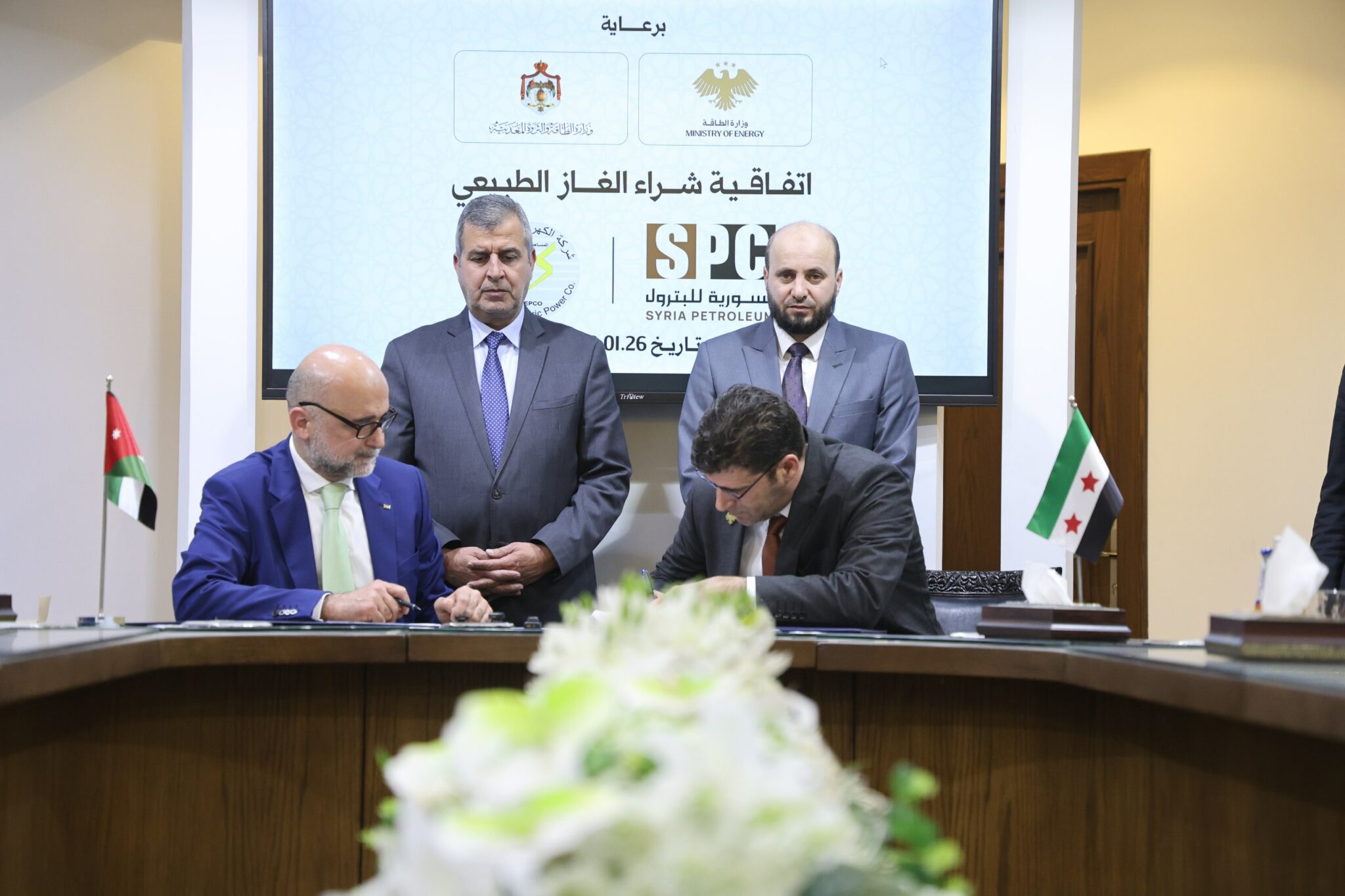 ووقّع الاتفاقية عن شركة الكهرباء الوطنية الأردنية مديرها العام الدكتور سفيان البطاينة، وعن الشركة السورية للبترول (SPC) نائب الرئيس التنفيذي للشركة المهندس هاشم الصالح ، وبحضور وزير الطاقة والثروة المعدنية الأردني الدكتور صالح الخرابشة ونظيره السوري المهندس محمد البشير.