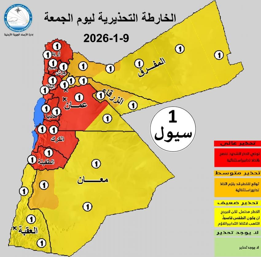 أردني – نشرت إدارة الأرصاد الجوية، خريطة تحذيرية محدثة ليوم غد الجمعة 9/1/2026، حذّرت فيها المواطنين من تأثيرات منخفض جوي متوقع، قد يتسبب بحالات تشكل السيول في عدد من مناطق المملكة، خاصة في المناطق الغربية والوسطى.