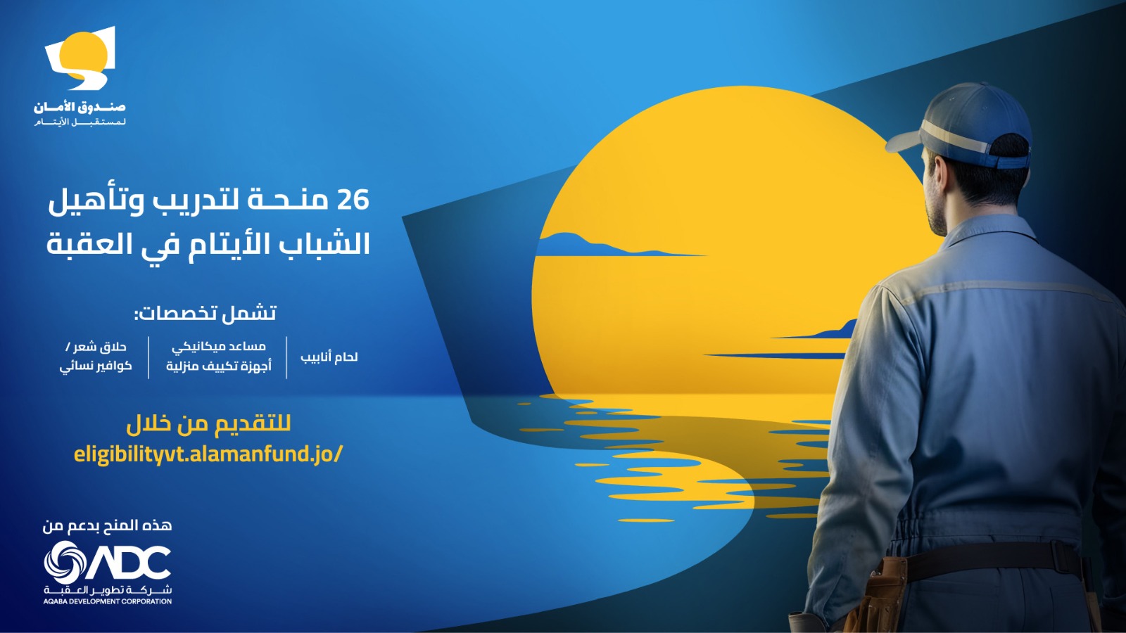 أردني – أعلن صندوق الأمان لمستقبل الأيتام عن فتح باب التقدّم لـ26 منحة تدريب مهني مخصصة للشباب الأيتام فوق سن 18 عاما في محافظة العقبة، بدعم من شركة تطوير العقبة، ضمن برنامج “منح تدريب وتأهيل الشباب الأيتام في العقبة” الذي أُطلق العام الماضي.