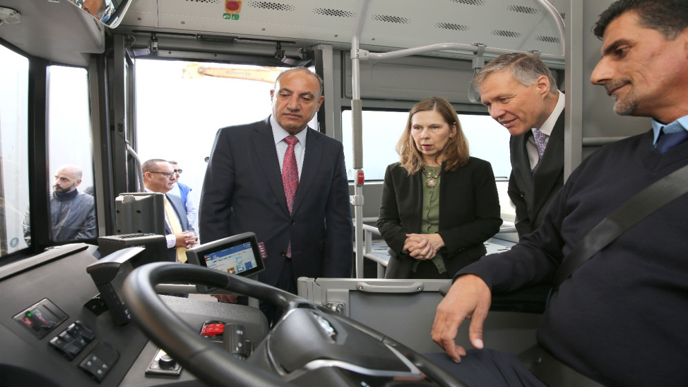 أردني – تفقد رئيس لجنة أمانة عمان الكبرى يوسف الشواربة ، الاحد، التشغيل التجريبي للحافلات الكهربائية الجديدة التي تم اطلاقها ضمن “المسار الأخضر” لمشروع الباص السريع، في محطة طارق، يرافقه السفير البريطاني لدى الأردن فيليب هول، و المديرة الإقليمية لمنطقة شرق المتوسط، البنك الأوروبي لإعادة الإعمار والتنمية ( EBRD ) غريتشن بيري.