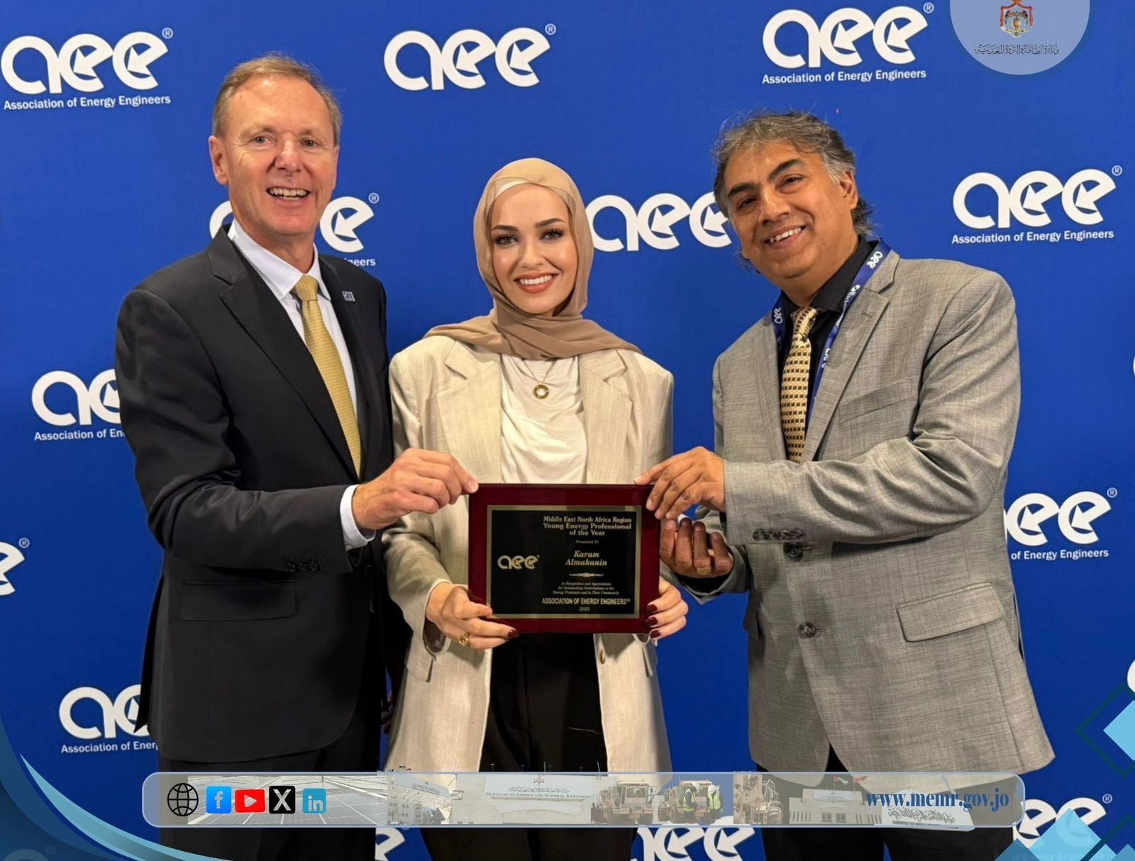 أردني – حازت المهندسة كرم العجارمة من وزارة الطاقة والثروة المعدنية على جائزة أفضل مهني شاب في مجال الطاقة (Young Energy Professional Award) لعام 2025 عن منطقة الشرق الأوسط، والتي تمنحها جمعية مهندسي الطاقة الأمريكية (AEE)، وذلك خلال مشاركتها في المؤتمر والمعرض العالمي للطاقة 2025 (AEE World Energy Conference and Expo)، الذي عُقد مؤخراً في مدينة أتلانتا بولاية جورجيا الأمريكية.