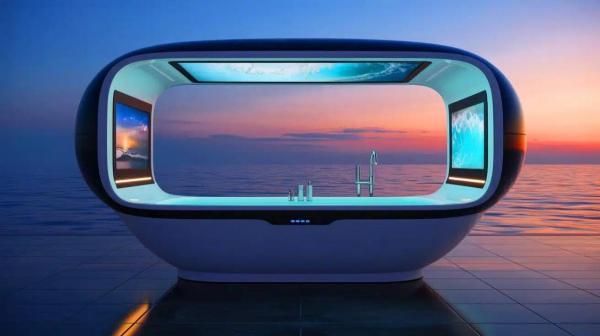 يأتي الجهاز على شكل حوض استحمام كبير وأنيق، مزود بسقف يغلق على المستخدم ليخلق بيئة خاصة وغامرة، عند الدخول، يستلقي الفرد في الحوض المريح والمصمم بطريقة منحنية، بينما يقوم العرض الرقمي المدمج بعرض مشاهد طبيعية هادئة مثل أمواج البحر والغروب وأصوات الشاطئ المريحة، لتبدأ رحلة استرخاء كاملة قبل بدء عملية الغسل الفعلية.