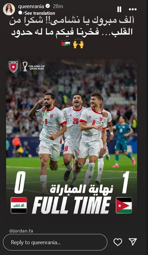 وكتبت جلالتها عبر منصة (إنستغرام): “ألف مبروك يا نشامى!! شكراً من القلب… فخرنا فيكم ما له حدود”.