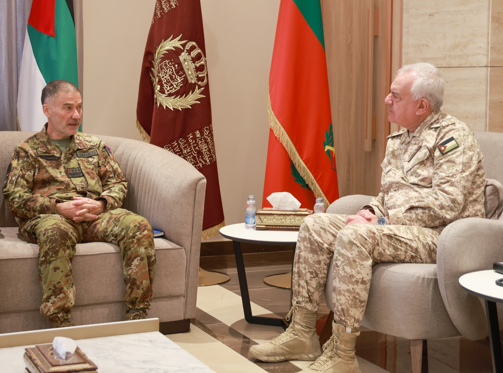 أردني – استقبل رئيس هيئة الأركان المشتركة اللواء الركن يوسف أحمد الحنيطي اليوم الخميس، في مكتبه بالقيادة العامة، قائد قيادة العمليات المشتركة للجيش الإيطالي، الفريق جوفاني ماريا يانّوتشي، وقائد القوات الخاصة الإيطالية الفريق باولو بيتسوتّي والوفد المرافق.