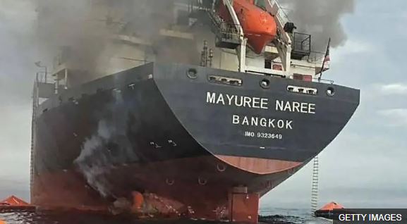 وكانت سفينتهم، “مايوري ناري”، قد أُصيبت الأربعاء الماضي بما يُعتقد أنه صاروخان إيرانيان، ما أدى إلى اندلاع حريق أجبر الطاقم على إخلائها.