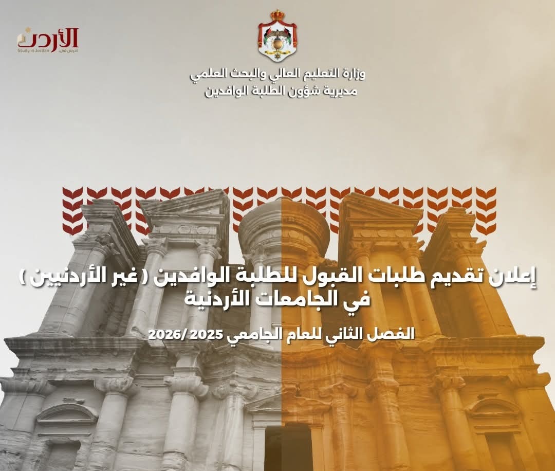 أردني – أعلنت وحدة شؤون الطلبة الوافدين في وزارة التعليم العالي والبحث العلمي في الأردن عن فتح باب تقديم طلبات القبول الموحد للطلبة الوافدين (غير الأردنيين) الراغبين بالدراسة في مختلف التخصصات، والبرامج، والدرجات بداية الفصل الثاني للعام الجامعي (2025-2026) في الجامعات/الكليات الأردنية.
